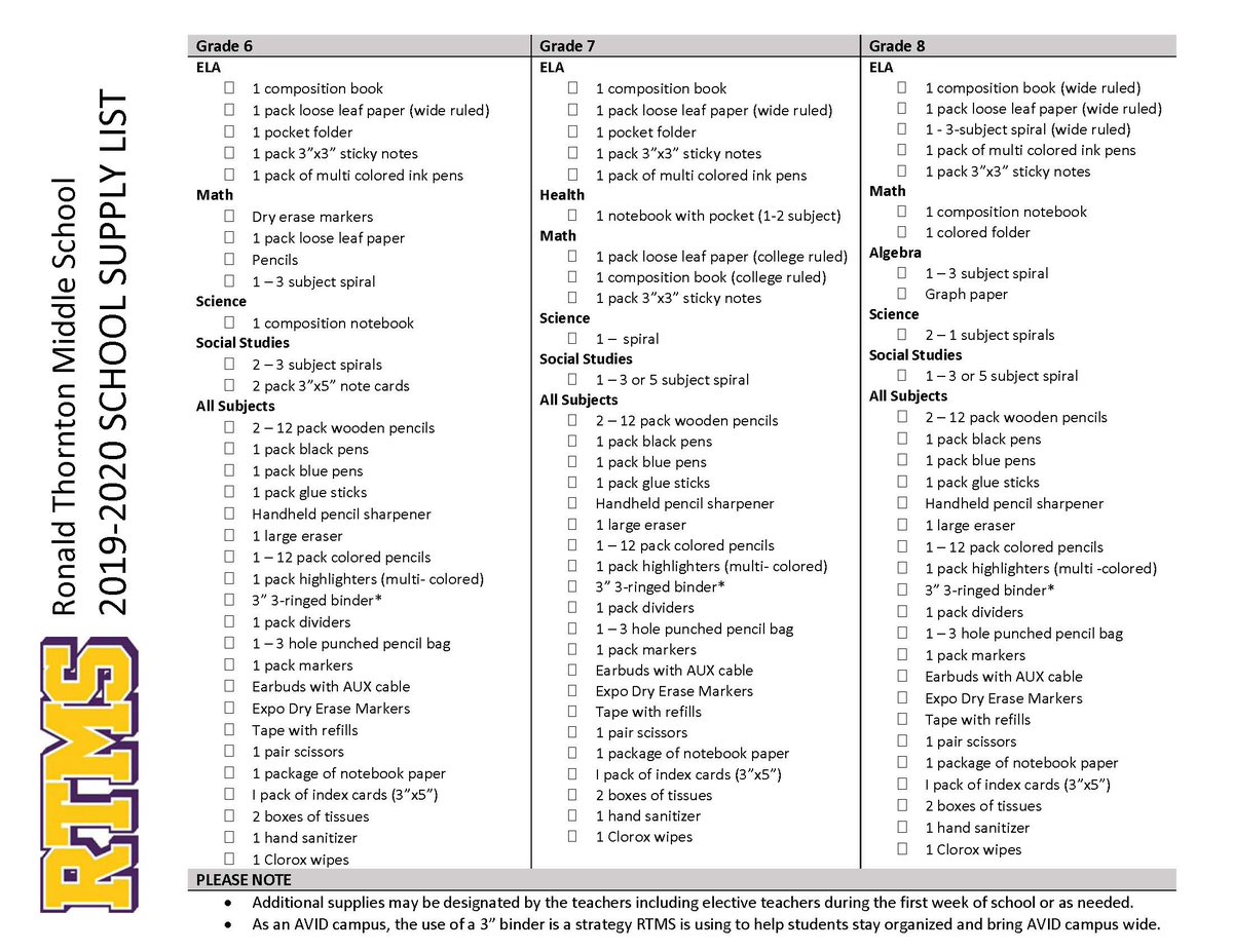Additional sixth grade supplies may be required during the school year. Slms school supplies 2017 18 6th grade school supplies unless otherwise noted the grid shows which classes need the particular items. The listed items may not exactly match the supplies requested by your childs school.