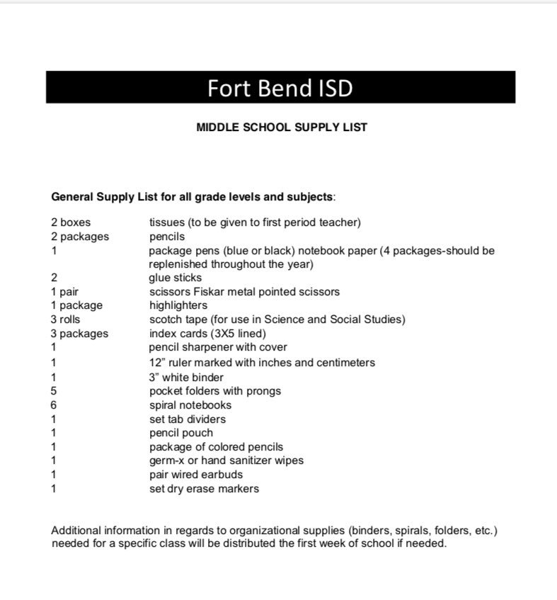 Our sartartia middle school fort bend isd middle school general supply list is ready to shop. School supply lists fort bend isd elementary and middle school principals have developed a general school supply list for all students. 2019 2020 6th grade supply list the following is a general list of 6th grade school supplies which your child will need to begin the school year.