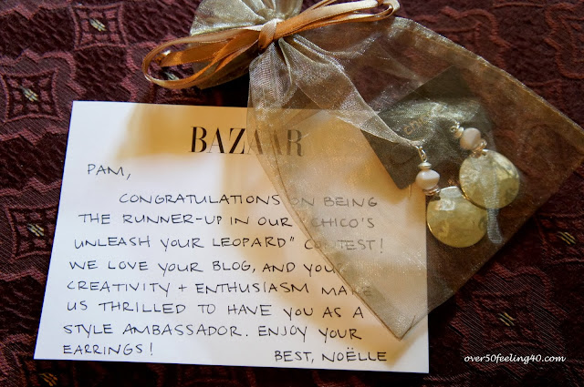 However, in the middle of it, I received this little perk...I won runner-up in the Chico's/Harper's Bazaar "Unleash your leopard" contest with THIS POST....and received a pair of earrings from Chico's. Thanks to my favorite fashion magazine and one of my favorite retailers!!