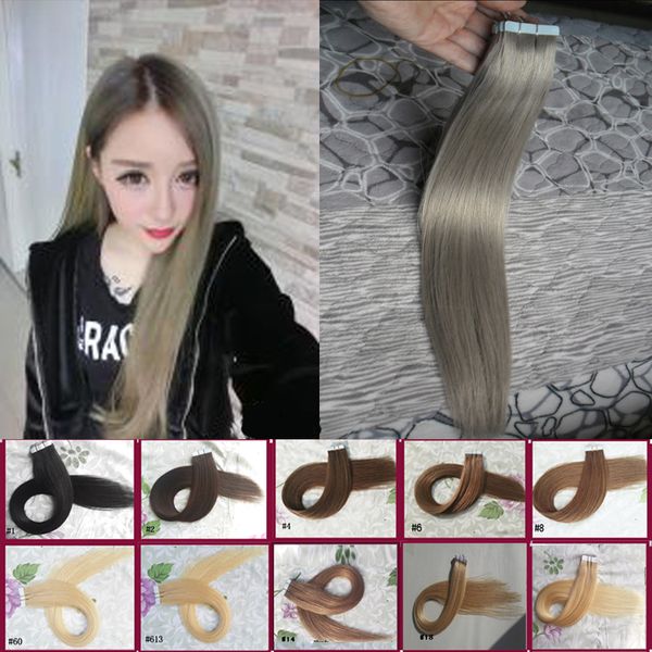 Silver Ash Gray Remy Tape In Human Hair Extensions Double Drawn Straight 100g Brazilian Hair Pu Skin Weft Tape In Hait Extensions Grey Virgin Hair