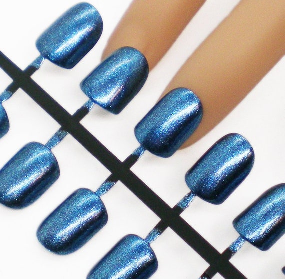 Artificial Nails Metallic Blue Press On Nails Hand Painted Etsy