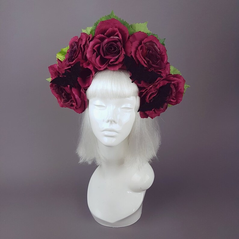 Deep Red Roses Flower Crown Bats Goth Bride Festival Headdress Halloween Fashion Gothic Headband Pagan Witch Fancy Dress Vampire