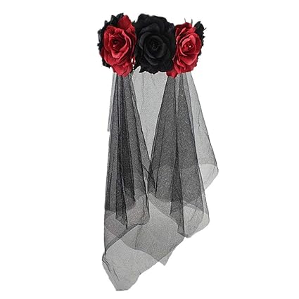 Precauti Gothic Bride Veil Black Red Rose Flower Wedding Headband Lace Veil Halloween Fancy Dress Day Of The Dead Headband Ladies Halloween Fancy